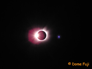 11月24日未明に皆既日食が見られました。昨年の12月にオーストラリアを出港したしらせ船上で部分日食は見られましたが、皆既日食を見るのは初めての隊員がほとんどでした。写真1から4のように向かって左側から欠けて行きました。周りの明るさは始めのうちはほとんど変わりませんでしたが、写真5くらいになった頃から急に暗くなり始めました。ここまでは太陽の光が直接射しているので、フィルター(ここでは何も写っていない黒いレントゲンフィルムを使いました)を通して見たり、写真を撮ったりしています。さらに太陽は月の影に隠れ、光が急激に弱くなった瞬間、写真6のように突然直接射す光が消えて、いわゆる黒い太陽とコロナが見えました。この瞬間は本当に息を飲む感動でした。いつもの空に、見たこともない全く別の天体があるように感じました。辺りは急に暗くなりましたが、残念ながら期待していたオーロラが見えるほどの暗さにはなりませんでした。この時の太陽はフィルターなしで見ることができ、写真もそのまま撮影したものです。この状態が1分強続き、写真7のように再び光が直接射しはじめました。この瞬間をダイヤモンドリングといいます。そして、すぐに肉眼では見られない明るさになり、写真8のように再び元に戻っていきました。写真9は栗崎隊員の撮影したダイヤモンドリングです。フィルターの影響で、赤っぽく写っています。写真10は藤田隊員の撮影した皆既日食の瞬間です。黒い太陽といわれる感じが良く出ています。写真11はこの天体ショーをくつろいでコタツで見ている隊員です。とにかく、映像や言葉では言い尽くせない感動でした。 |