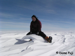11月24日、栗崎、中野隊員と私の3名で45次飛行隊5名の出迎え旅行に出発しました。GPSという、人工衛星から送られてくる電波で自分たちの位置を知り、全く誰も通ったことのない雪原を約430km走り、航空拠点を作って飛行機の来るのを待つ旅行です。写真1は雪原を走る雪上車です。帰路にも使いますし、来年、再来年も同じルートを走って出迎え旅行をするので、5kmおきに標識用の赤旗を立て、10kmおきにドラム缶を置いて標識にします。標識用の赤旗は雪の積もり具合を測定する雪尺の役目も果たすので、1本ずつ長さや雪面の状況を記録しておきます(写真2)。写真3は気象観測をしているところです。毎日朝、昼、晩に欠かさず観測を続けました。雪面は場所によって様々な表情を見せ、写真4のような、鏡のように真っ平らで太陽の光が反射するような光沢雪面や、写真5のような、積もった雪が風で削られてサスツルギと呼ばれるでこぼこの場所があったりします。サスツルギは波のようにも、水の上に顔を出すイルカのようにも見えます。というわけで、写真6はイルカに乗った少年をイメージしてみました。写真7は雪上車への給油風景です。燃料ドラムを積んだそりの風上側と風下側に雪上車を1台ずつ停めて、毎日昼と夕方に給油します。こうして5日間かけて航空拠点の候補地に到着しました。(平らな場所を選んだのでドームふじからの距離は約420kmになりました) |